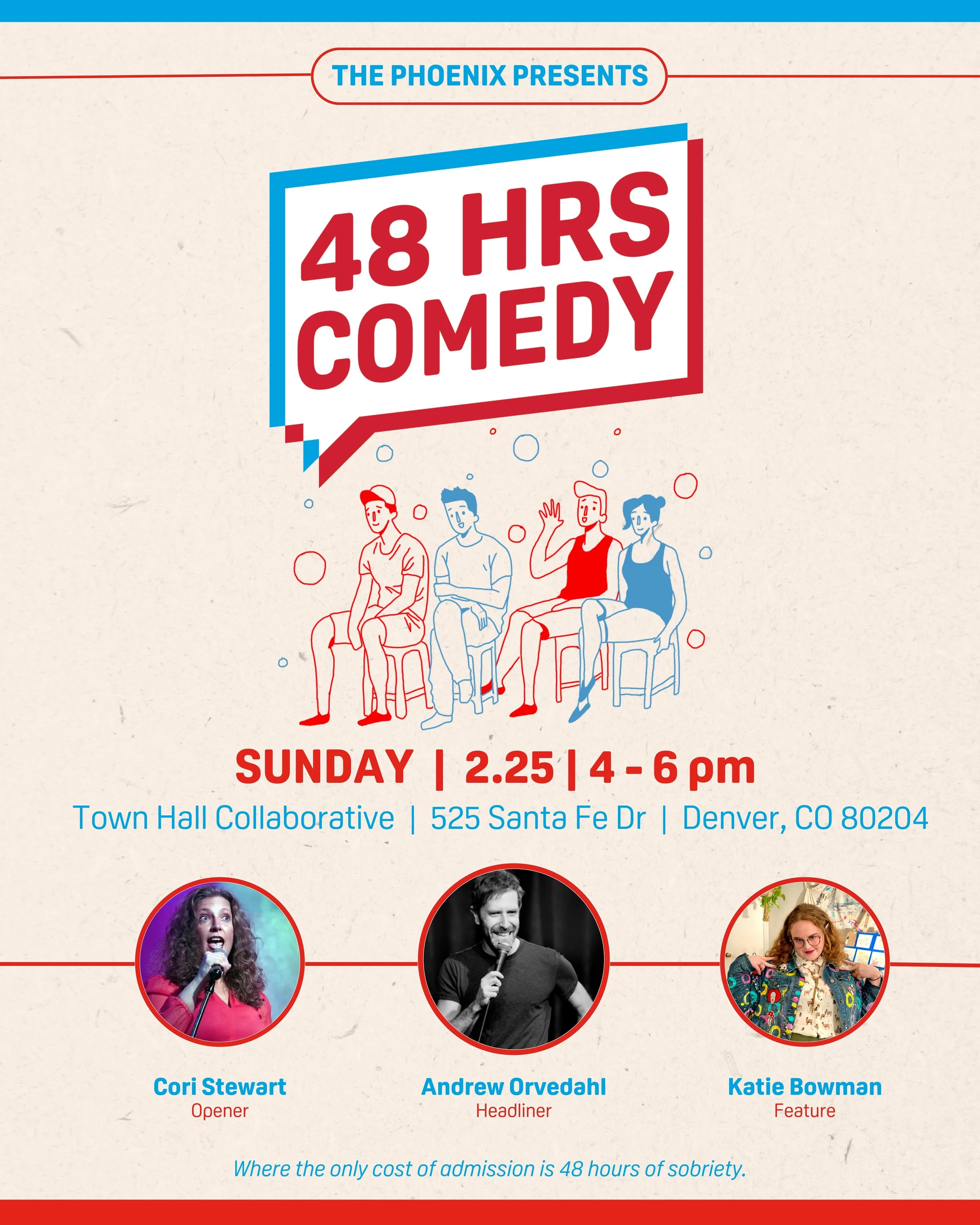 Back to All Events 48 Hours Comedy show Sunday, February 25, 2024 4:00 PM 6:00 PM Town Hall Collaborative 525 Santa Fe Drive Denver, CO, 80204 United States (map) Google Calendar ICS A stand-up comedy special leveraging laughter to build a sober community for people in recovery, their allies, the sober curious, and the community at large. Buy tickets here