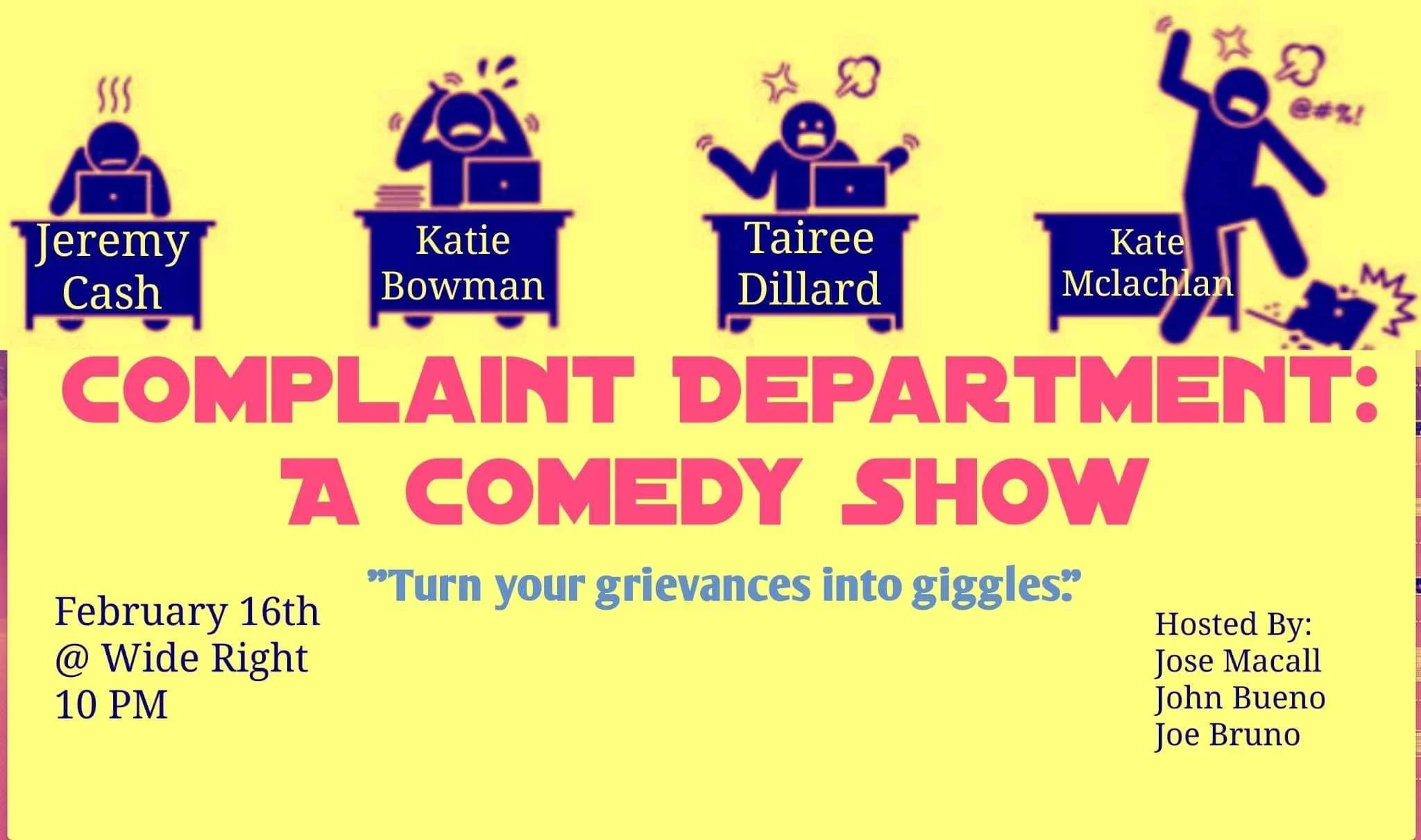Complaint Department show at Wide Right Friday, February 16, 2024 10:00 PM 10:30 PM Wide Right 2100 Curtis Street Denver, CO, 80205 United States (map) Google Calendar ICS buy tickets here